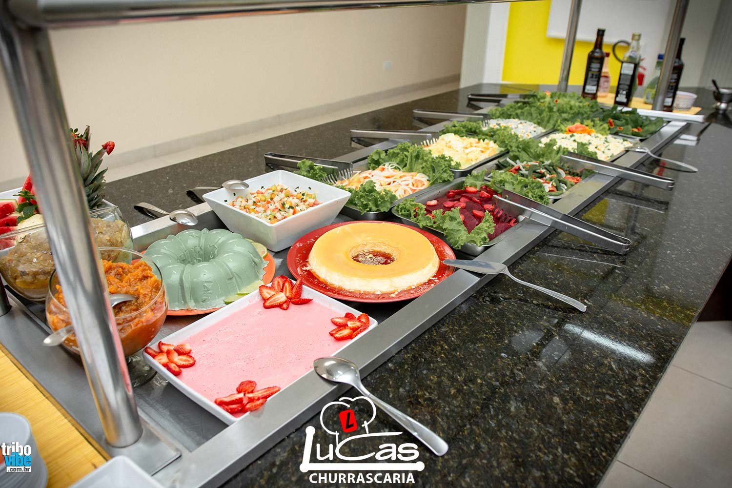 Na churrascaria é possível encontrar 12 pratos quentes, 10 pratos frios e muitas opções em sobremesa, bebidas em geral, num ambiente climatizado e com profissionais treinados para melhor te atender.