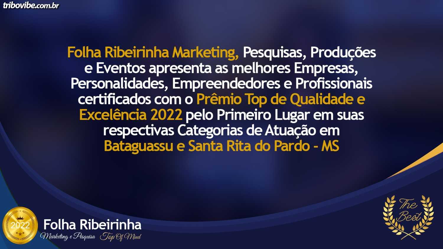Folha Ribeirinha Marketing, Pesquisas, Produções e Eventos apresenta as melhores Empresas, Personalidades, Empreendedores e Profissionais certificados com o Prêmio Top de Qualidade e Excelência 2022 pelo Primeiro Lugar em suas respectivas Categorias de Atuação em Bataguassu – MS e Santa Rita do Pardo-MS. Evento realizado na noite de sexta-feira 29 de Abril.