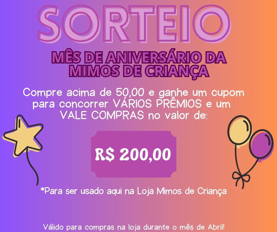 E tem mais! Durante todo o mês de abril, os clientes que fizerem compras acima de R$ 50,00 concorrem a um vale compras no valor de R$ 200,00, além de diversos outros prêmios. Aproveite essa oportunidade para renovar o guarda-roupa dos pequenos e ainda concorrer a prêmios incríveis.