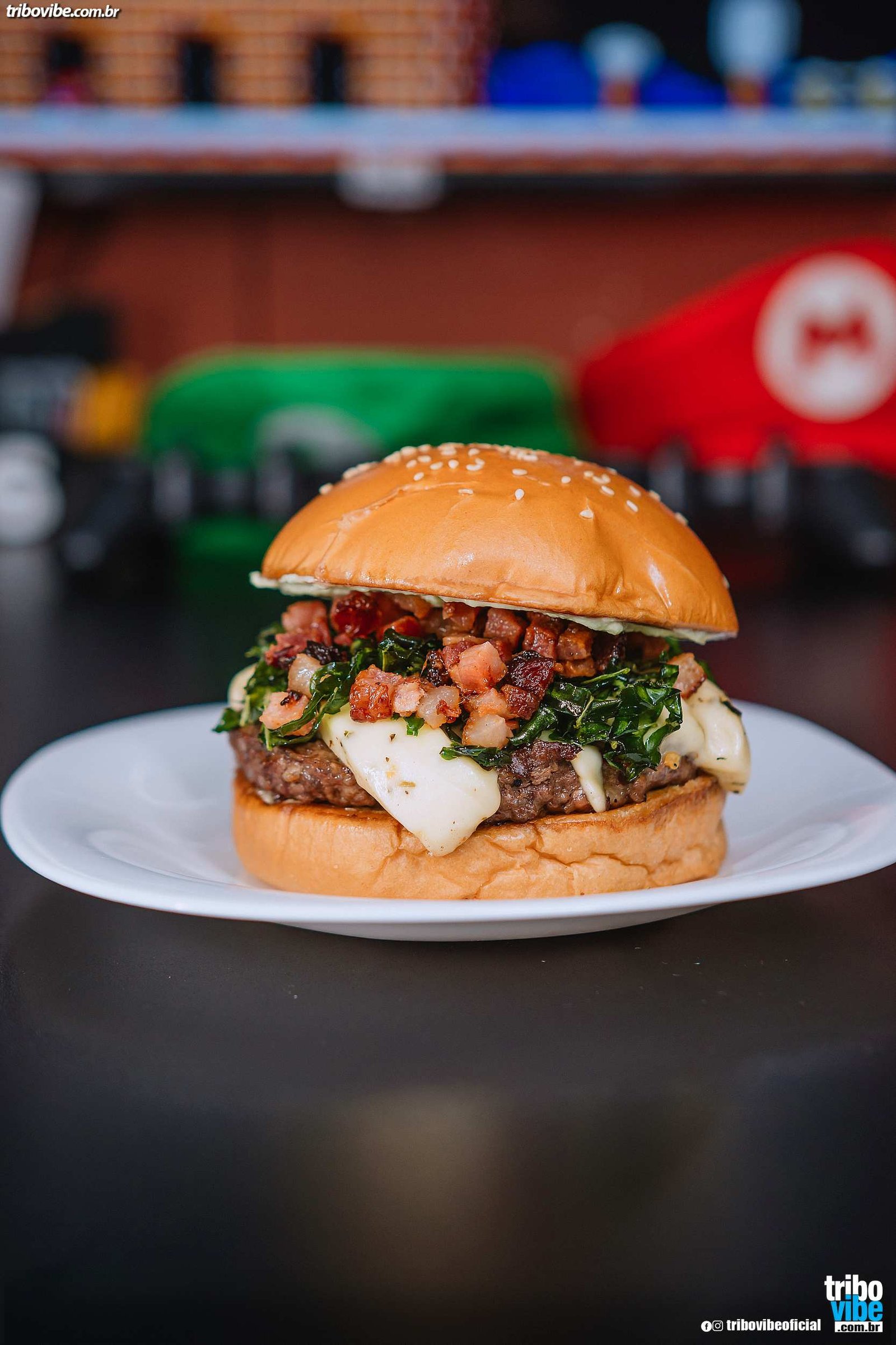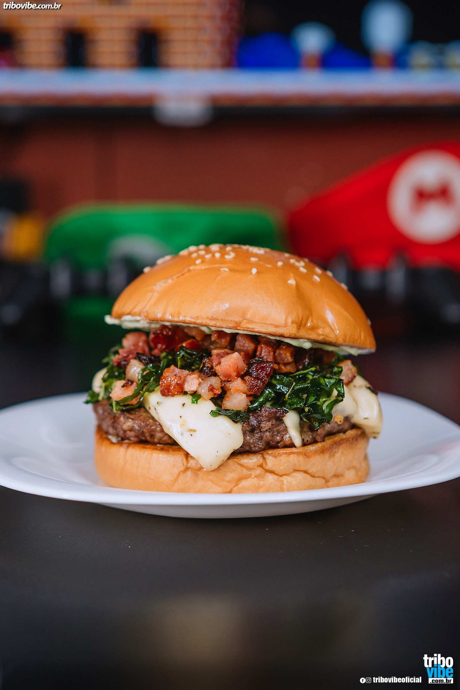 Pão tradicional, Hambúrguer, Bacon em cubos, Queijo coalho, Mussarela, Couve Crispy e um toque de Molho verde.