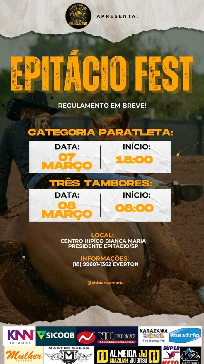 Prepare-se para um evento inesquecível que promete encantar e emocionar o público de Presidente Epitácio-SP! O Epitácio Fest, organizado pelo Centro Hípico Bianca Maria (CHBM), acontece nos dias 7 e 8 de março e traz competições emocionantes, histórias de superação e o melhor do universo equestre.