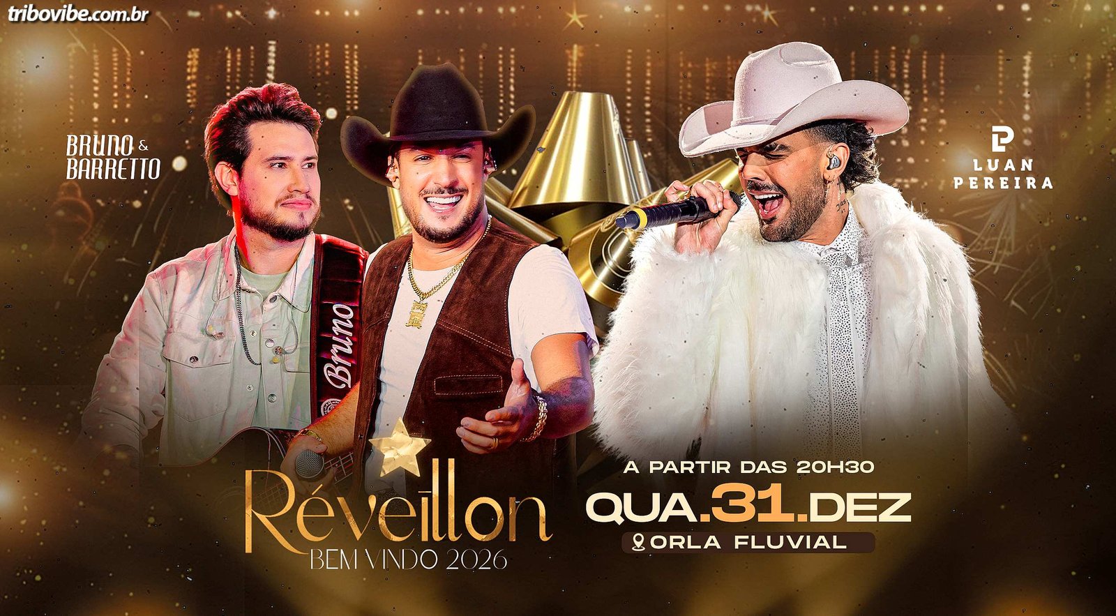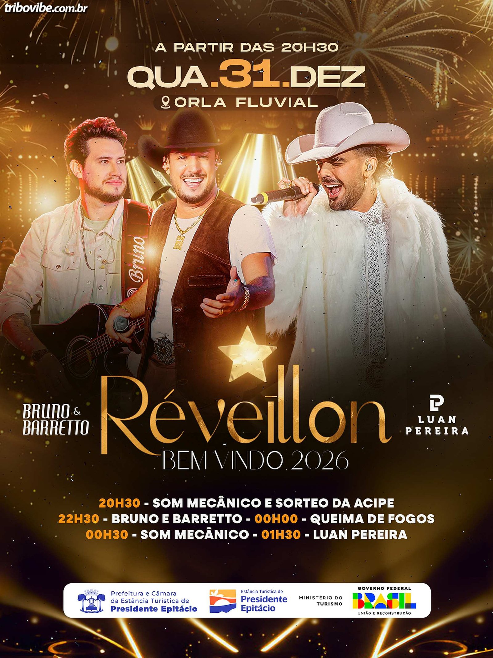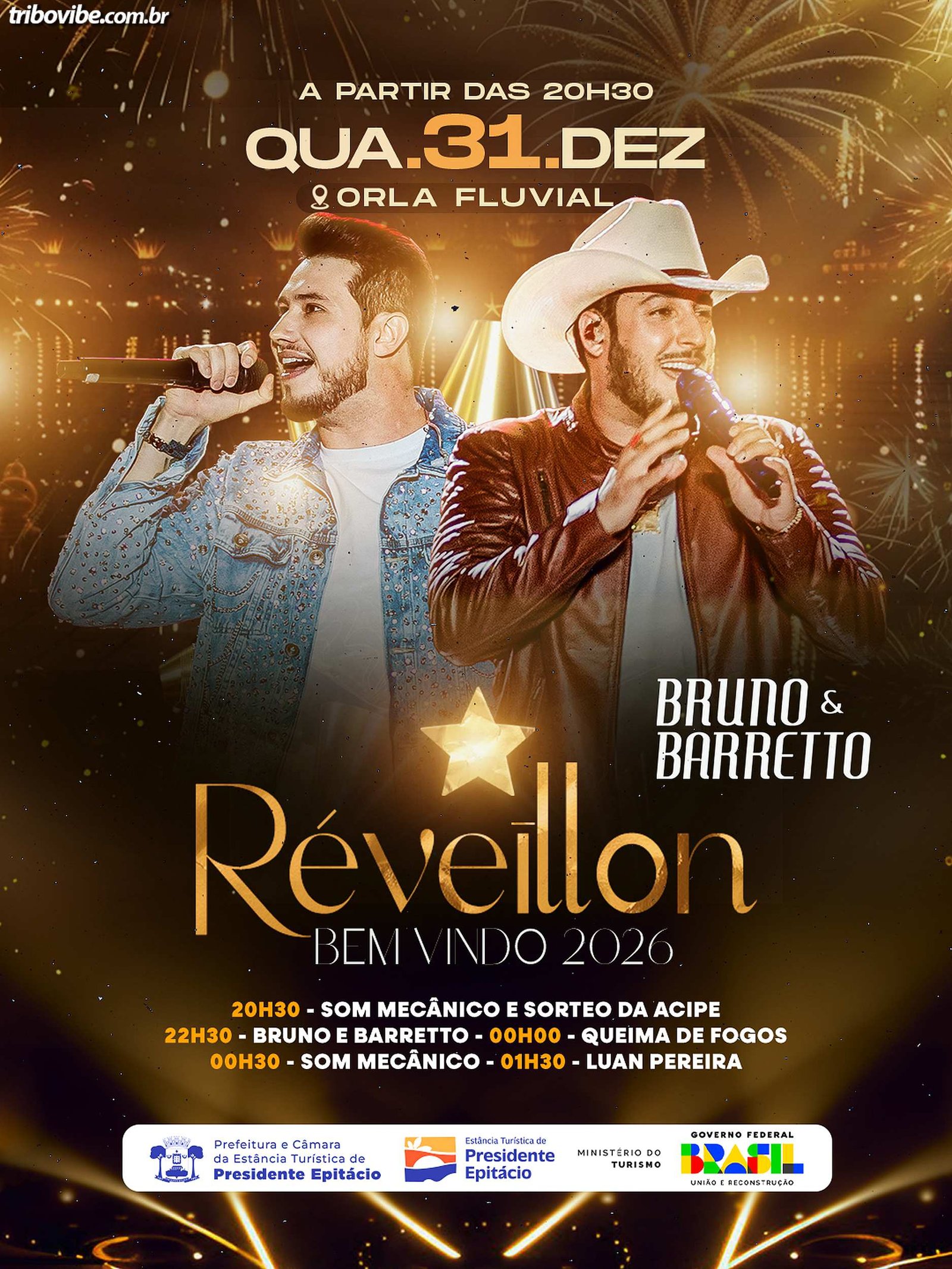 Às 22h30, Bruno e Barretto sobem ao palco, seguidos pela grande queima de fogos à meia-noite, marcando oficialmente a virada do ano. Após a queima de fogos, a festa continua com som mecânico e, às 01h30, o show de Luan Pereira encerra a programação musical da noite.